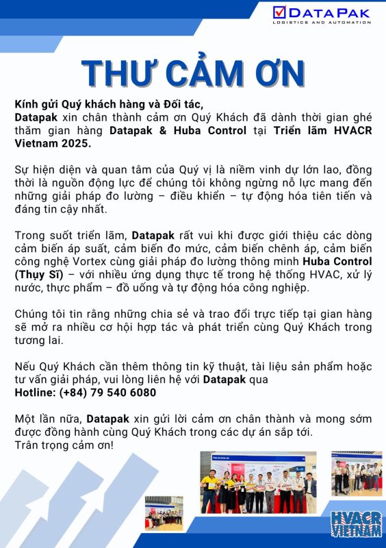 Tham gia triển lãm năm nay, Datapak phối hợp cùng Huba Control (Thụy Sĩ) mang đến không gian trưng bày hiện đại, giới thiệu các giải pháp đo lường – điều khiển – giám sát năng lượng tiên tiến, ứng dụng rộng rãi trong hệ thống HVAC, xử lý nước, thực phẩm – đồ uống và tự động hóa công nghiệp.