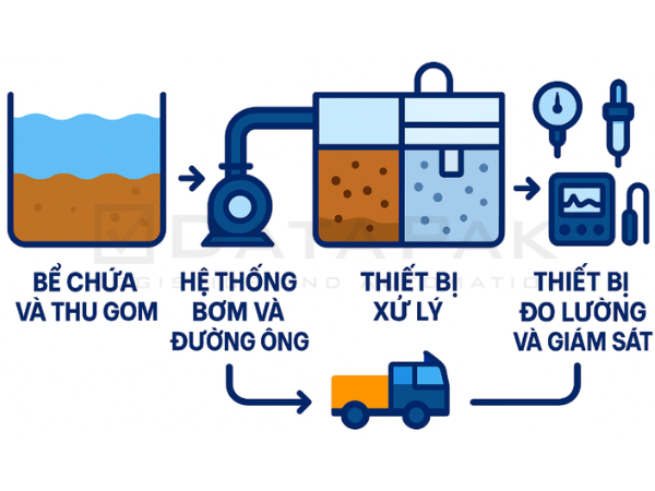 - Thiết bị xử lý: bể lắng, bể hiếu khí, màng lọc, hệ thống khử trùng.